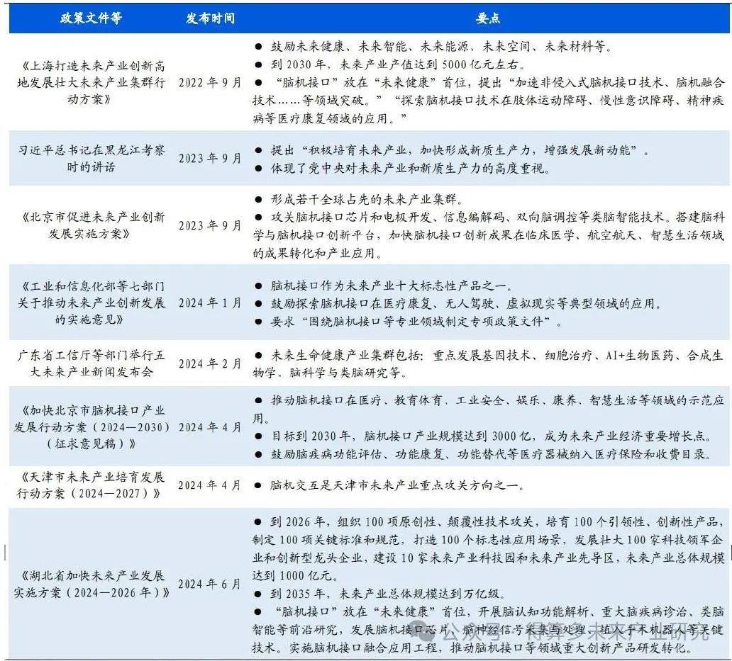 腦機接口是新質(zhì)生產(chǎn)力和未來產(chǎn)業(yè)發(fā)展方向。總書記2023 年9 月在黑龍江考察時指出“積極培育未來產(chǎn)業(yè),加快形成新質(zhì)生產(chǎn)力,增強發(fā)展新動能”。中央經(jīng)濟工作會議指出“要以科技創(chuàng)新推動產(chǎn)業(yè)創(chuàng)新,特別是以顛覆性技術(shù)和前沿技術(shù)催生新產(chǎn)業(yè)、新模式、新動能,發(fā)展新質(zhì)生產(chǎn)力”。當(dāng)前,新一輪科技革命和產(chǎn)業(yè)變革加速演進,重大前沿技術(shù)、顛覆性技術(shù)持續(xù)涌現(xiàn),科技創(chuàng)新和產(chǎn)業(yè)發(fā)展融合不斷加深,催生出元宇宙、人形機器人、腦機接口、量子信息等新產(chǎn)業(yè)發(fā)展方向,大力培育未來產(chǎn)業(yè)已成為引領(lǐng)科技進步、帶動產(chǎn)業(yè)升級、開辟新賽道、塑造新質(zhì)生產(chǎn)力的戰(zhàn)略選擇。北京、上海、天津、湖北等多地陸續(xù)出臺培育未來產(chǎn)業(yè)的政策文件,鼓勵腦機接口產(chǎn)業(yè)發(fā)展。2024 年4月,北京出臺《加快北京市腦機接口產(chǎn)業(yè)發(fā)展行動方案(2024-2030)(征求意見稿)》,是首個省級層面腦機接口專項產(chǎn)業(yè)政策文件。