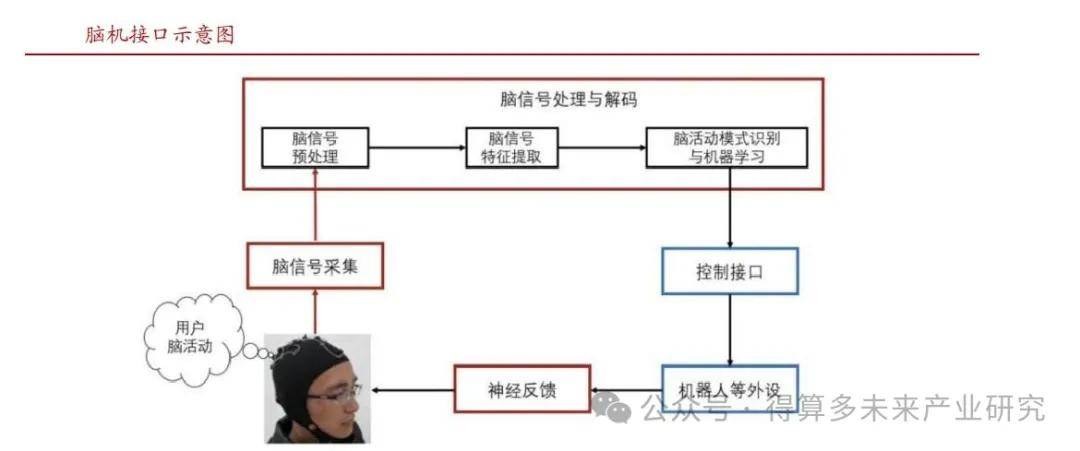 腦機接口(BCI-Brain-MachineInterface)的定義:指在人或動物大腦與外部設(shè)備之間創(chuàng)建的直接連接實現(xiàn)腦與設(shè)備的信息交換,其工作流程包括腦電信號的采集和獲取、信號處理、信號的輸出和執(zhí)行,最終再將信號反饋給大腦。