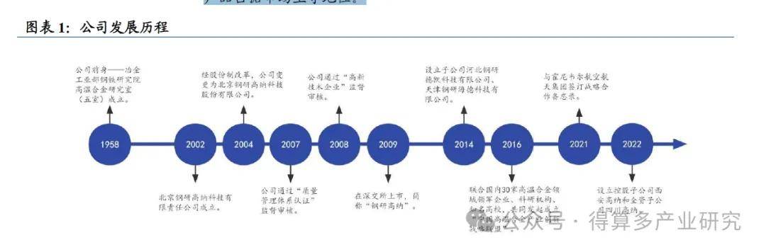 公司成立于2002 年,前身最早可追溯至1958 年冶金工業(yè)部鋼鐵研究院高溫合金研究室(五室)的成立,2004 年公司獲國務(wù)院批準(zhǔn)進(jìn)行股份制改革,2009 年在深圳證券交易所創(chuàng)業(yè)板上市,股票簡稱“鋼研高納”。公司主要從事航空航天、兵器、艦船和電力行業(yè)所需的先進(jìn)合金材料的研發(fā)、生產(chǎn)和銷售,是國內(nèi)航空、航天、兵器、艦船和核電等行業(yè)用高溫合金等材料及制品重要的研發(fā)生產(chǎn)基地。公司是目前我國高溫合金領(lǐng)域技術(shù)水平最為先進(jìn)、生產(chǎn)種類最為齊全的企業(yè)之一,在多個(gè)細(xì)分產(chǎn)品占據(jù)市場主導(dǎo)地位。
